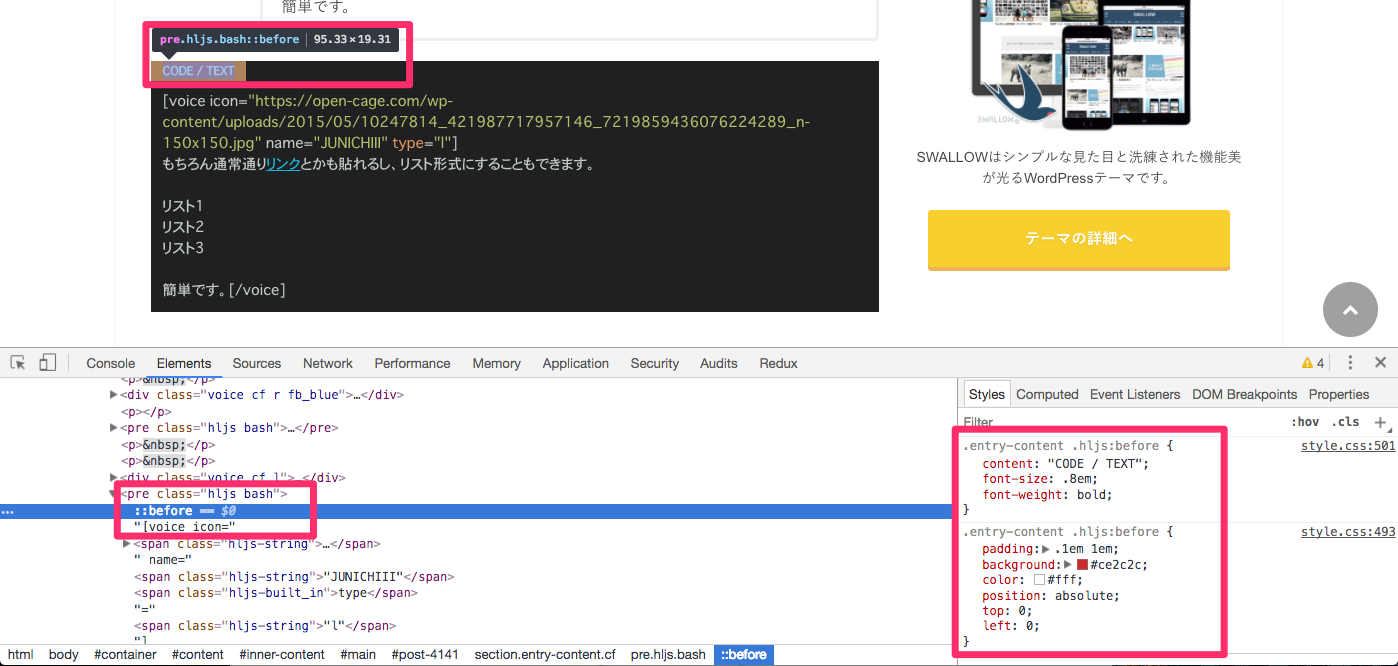 higlight.jsを利用するとhljsというクラスがソースコード部分に付与されていることがわかります。そしてhljsクラスに擬似要素の:beforeを適用していることがわかります。そしてそのbeforeが拡張子部分ということがわかります。CODE/TEXTの部分はHTML上に書かれているのではなくCSSに書かれているようです。