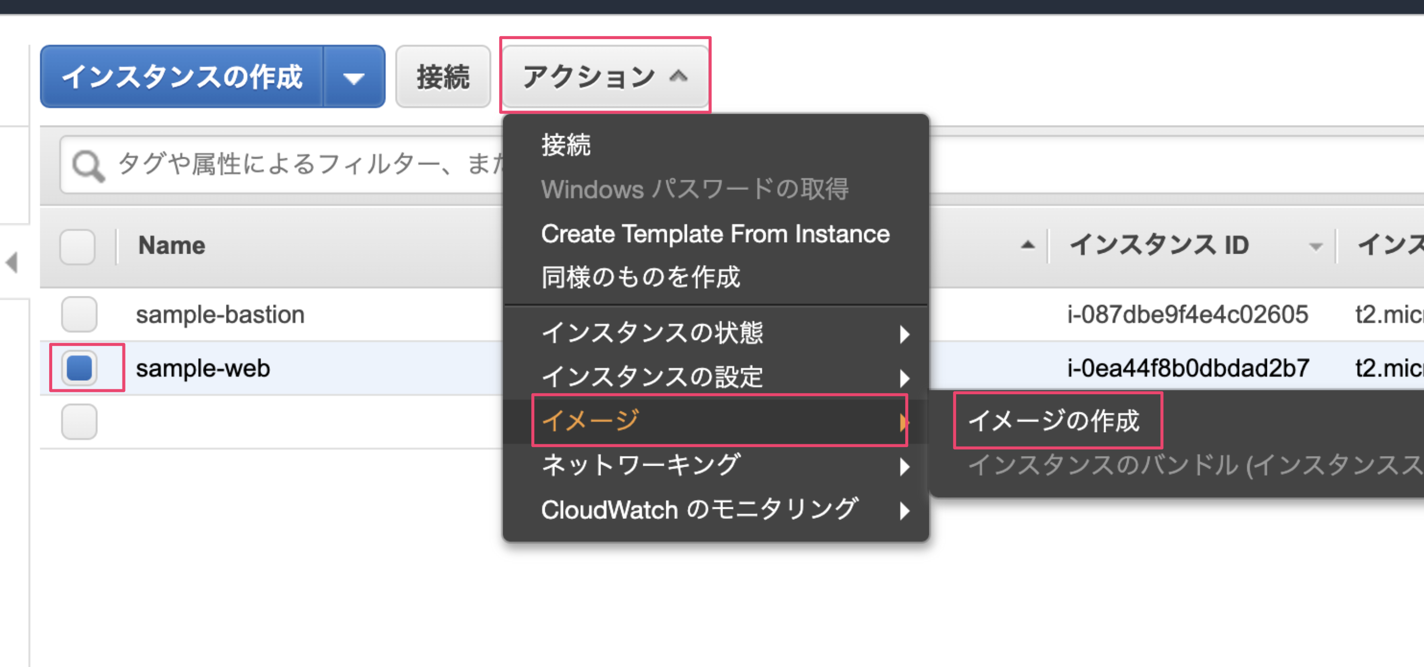 取得したAMIを利用してインスタンスを作成することで、インスタンスを複製することができます。