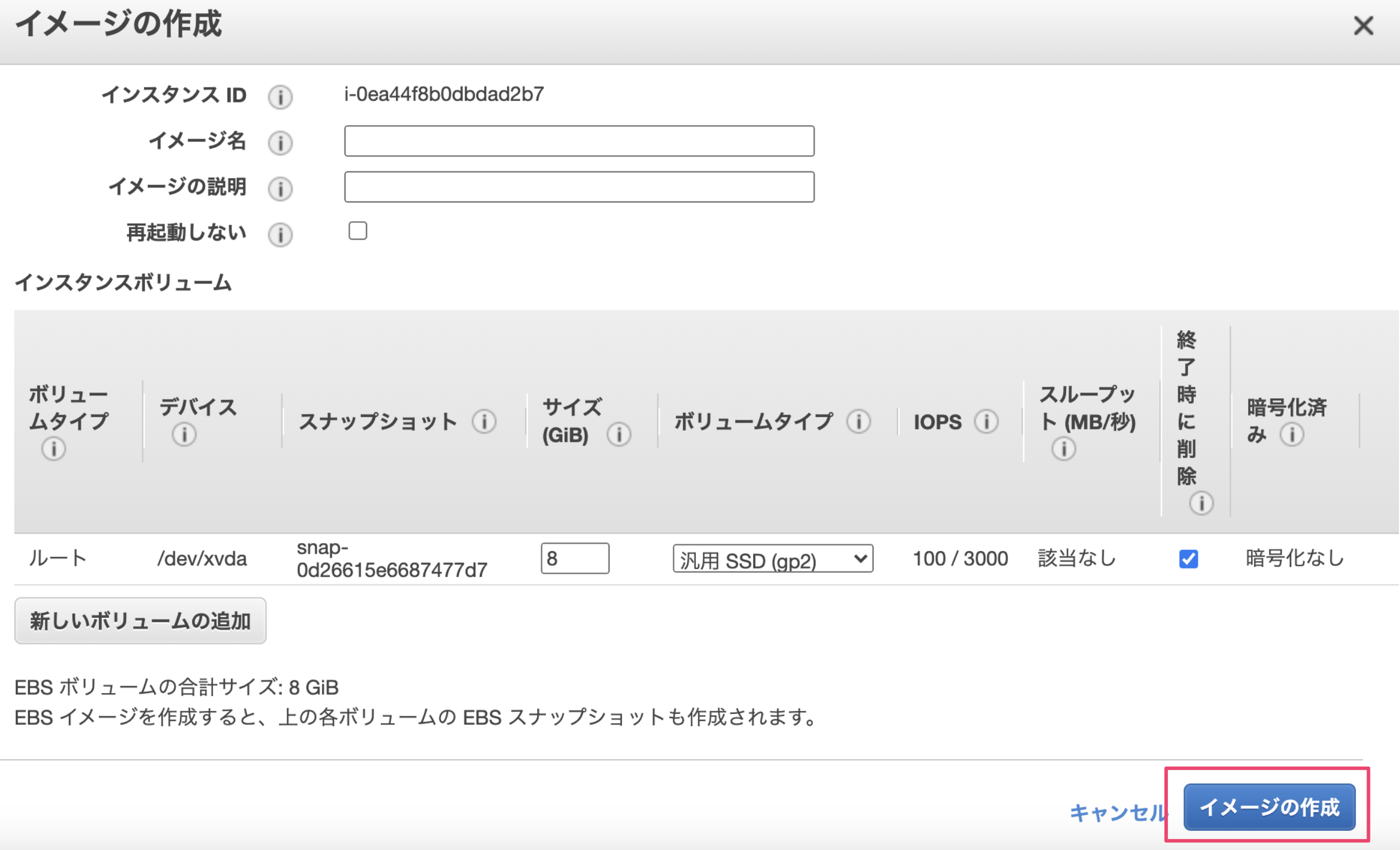 適当なイメージ名を設定し、『イメージの作成』を選択します。