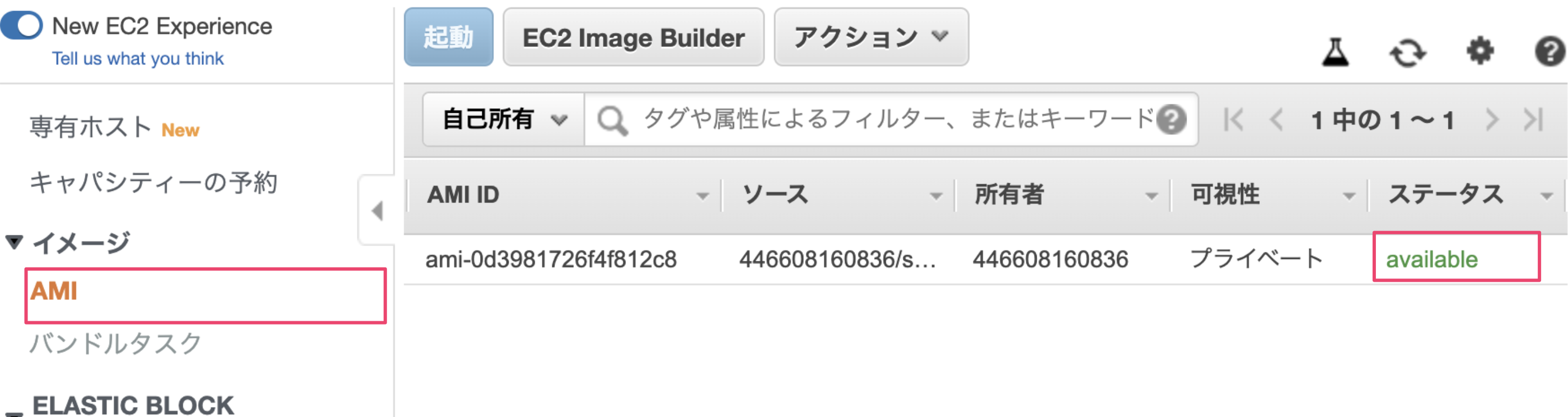 EC2ダッシュボードの『イメージ』→『AMI』でAMIの作成ステータスが確認できます。