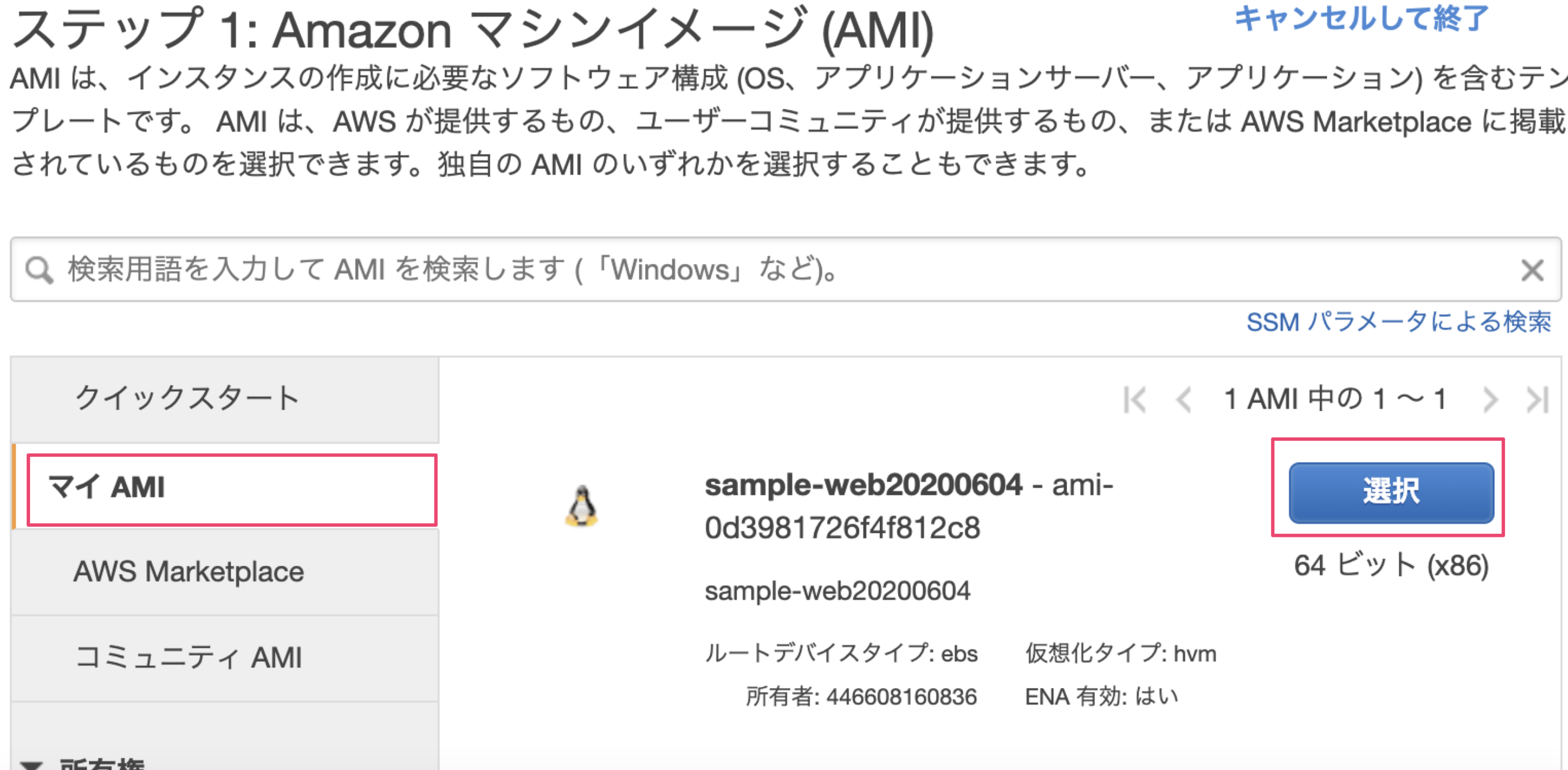『マイAMI』タブに先ほど作成したAMIが表示されているので、これを選択します。