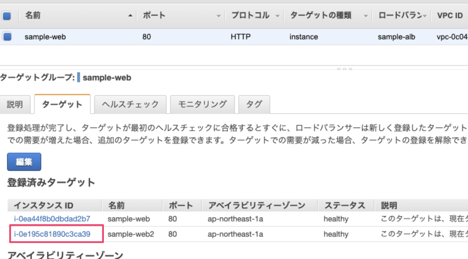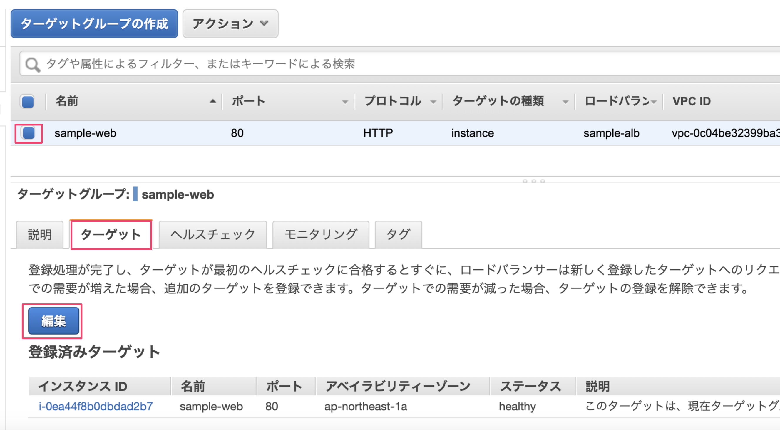 スケールアウト対象のターゲットグループにチェックをいれ、『ターゲット』タブの『編集』を選択します。