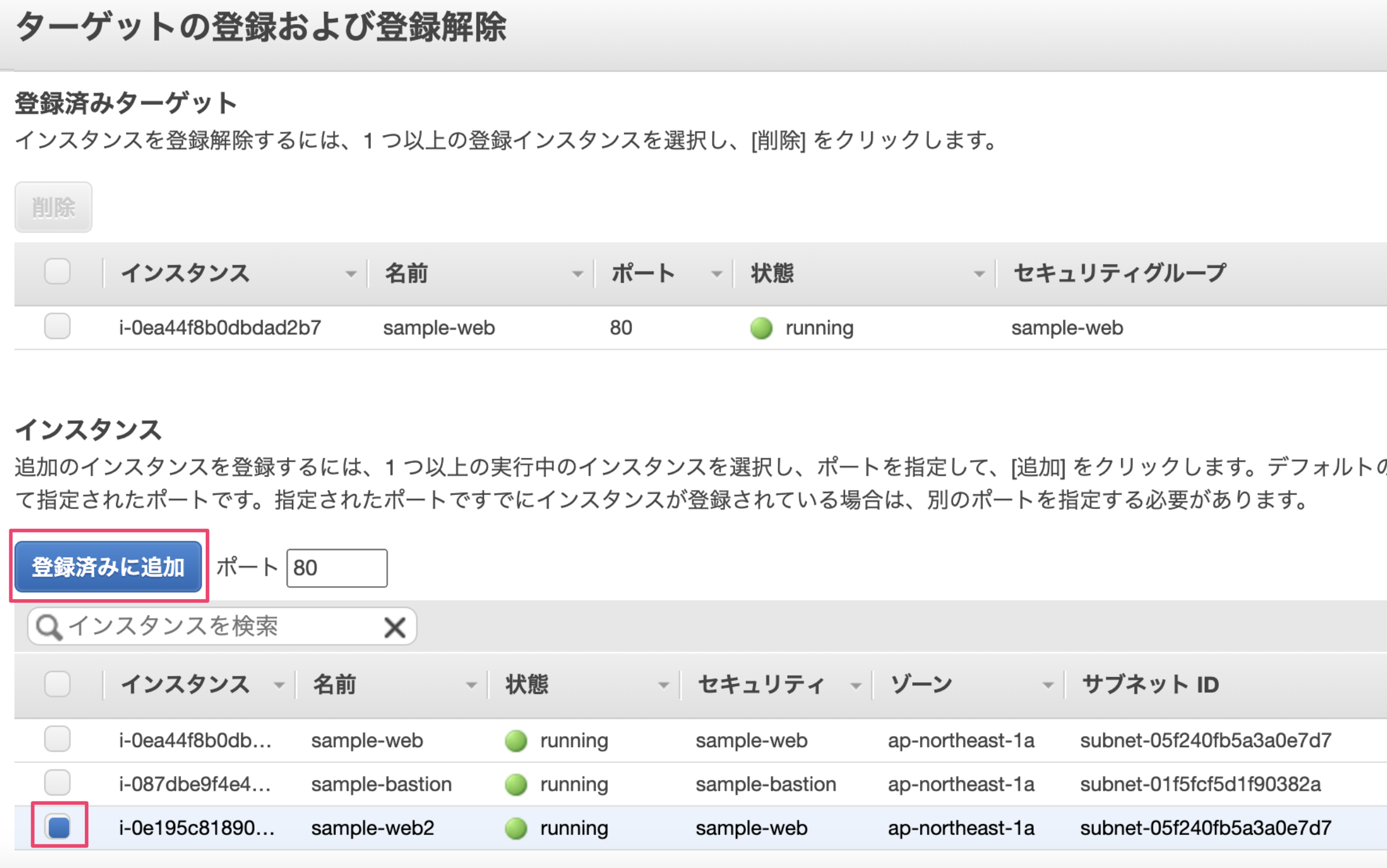 登録後、登録済みターゲットにインスタンスが追加されていればOKです。