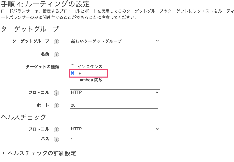 - Fargateをロードバランシングする場合はロードバランサーのターゲットは『ip』にする