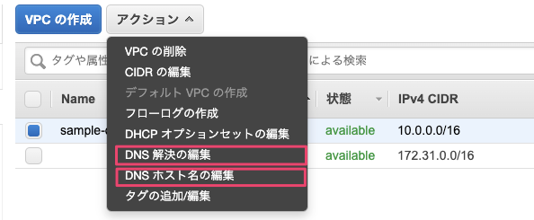 PrivateLink作成対象のVPCにチェックをし、『DNS解決の編集』と『DNSホスト名の編集』から『有効化』にチェックがついているか確認してください。
