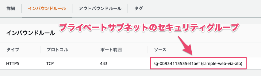 よって、プライベートサブネット用のセキュリティグループからのインバウンドアクセスを許可するセキュリティグループを作成します。プロトコルはHTTPSです。