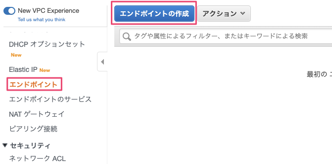 VPCダッシュボードの『エンドポイント』→『エンドポイントの作成』を選択します。