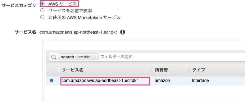 なお、各サービス名の頭にはcom.amazonaws.[リージョン名]がつきます。