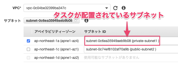 『サブネット』はタスクが配置されているプライベートサブネットを指定します。