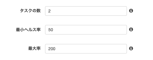 これは、タスクは少なくとも1つ起動していればOK(タスク数2 x 最小ヘルス率0.5 = 1)、タスク数4までhealty状態のタスクができることを許容する(タスク数2 x 最大率2.0 = 4)という方針です。