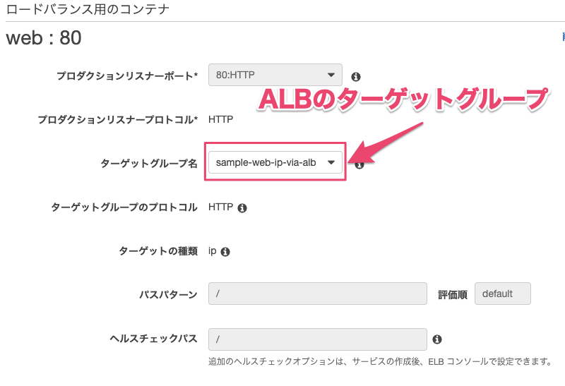『ロードバランス用のコンテナ』は『ターゲットグループ名』にロードバランサーのターゲットグループを指定します。
