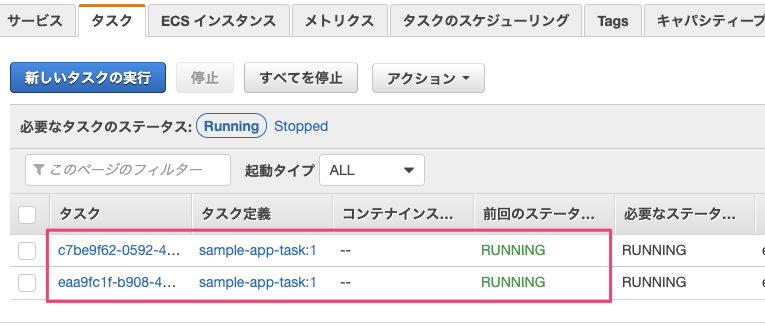 デプロイメントが正常に実行されるとタスク一覧にタスクが表示されます。今回はタスク数を2つにしたため、2つのタスクがRUNNING状態になっています。