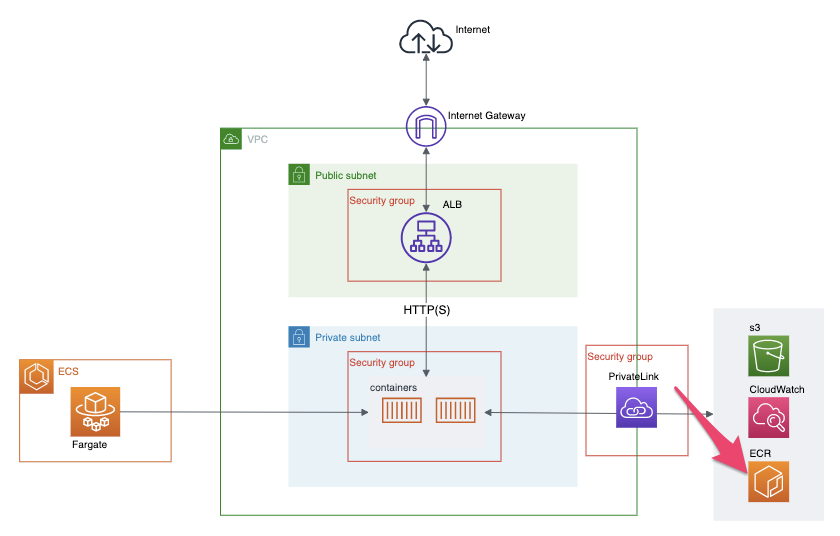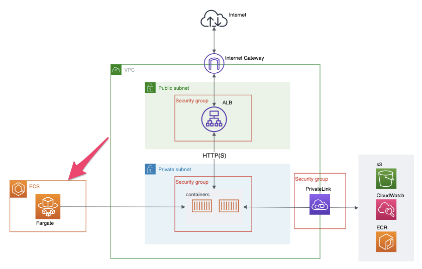 - Fargateをプライベートサブネットで起動させる場合はs3、logs、ecr.dkrのPrivateLinkが必要
