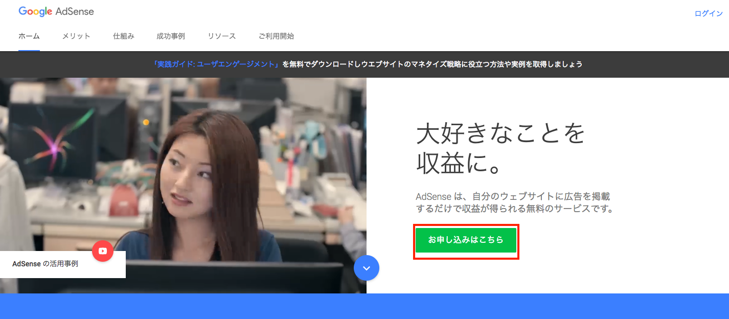 まずはGoogleアドセンスのサイトにいき、申し込みボタンを押します。