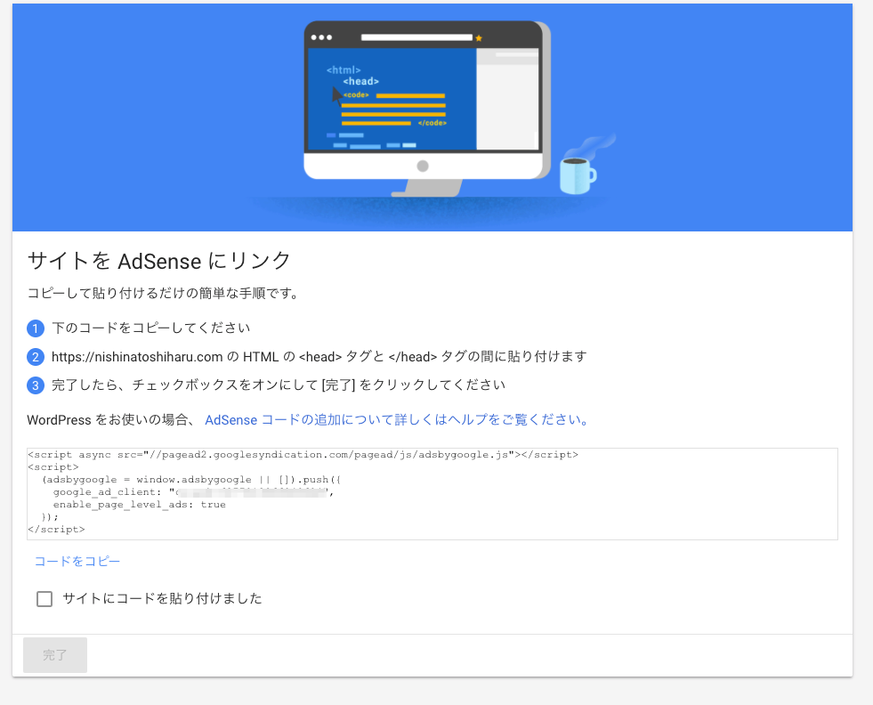 入力が終わるとGoogleアドセンスをWordPressに連携させるためのコードが表示されます。