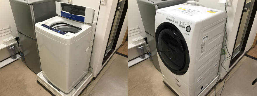 左: 旧 縦型洗濯機、右: 新 ドラム式洗濯機ドラム式洗濯機の扉も壁にぶつかることなく問題なく開くことができました。