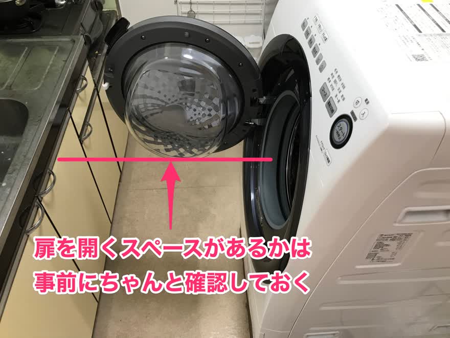 縦型洗濯機には『扉を開く』という概念がないため、もし縦型洗濯機からドラム式洗濯機に買い換える場合は扉を開くスペースが十分にあるかチェックしておくことをオススメします。