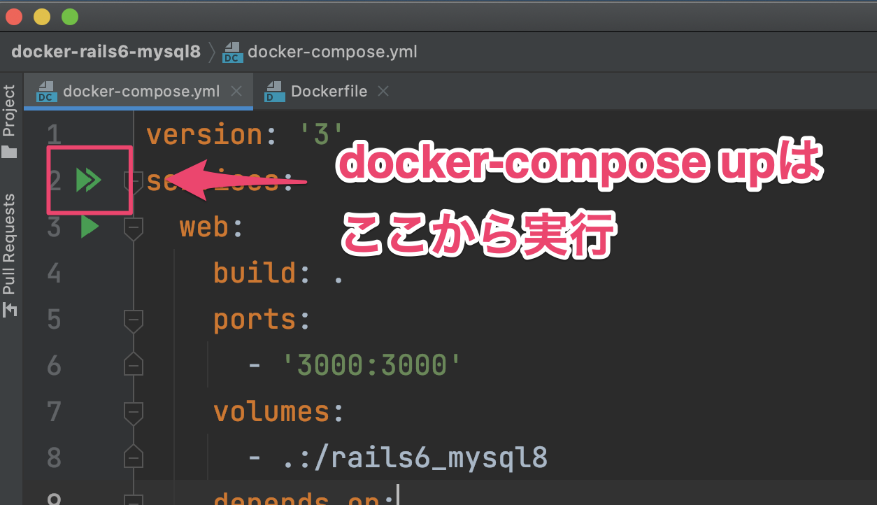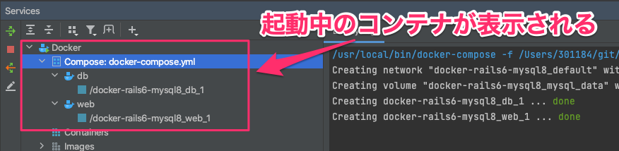 docker-compose.ymlのservicesプロパティの部分にある矢印アイコンをクリックするとdocker-compose upが実行されます。
