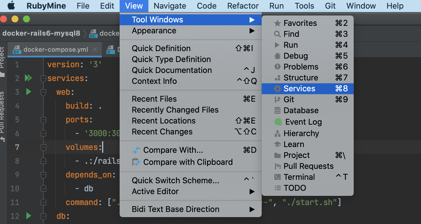 「View」 → 「Tool Windows」 → 「Services」を選択します。