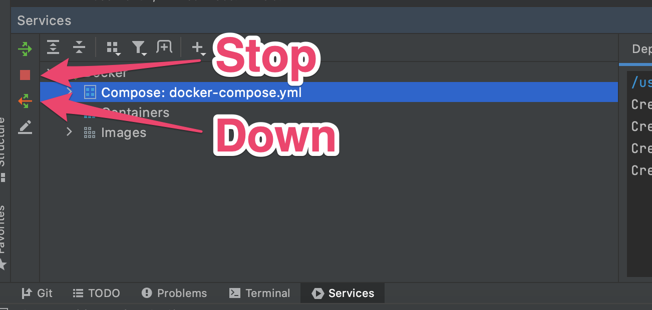 Services画面の左側にあるアイコンをクリックするとコンテナの終了(stop)や削除(down)ができます。