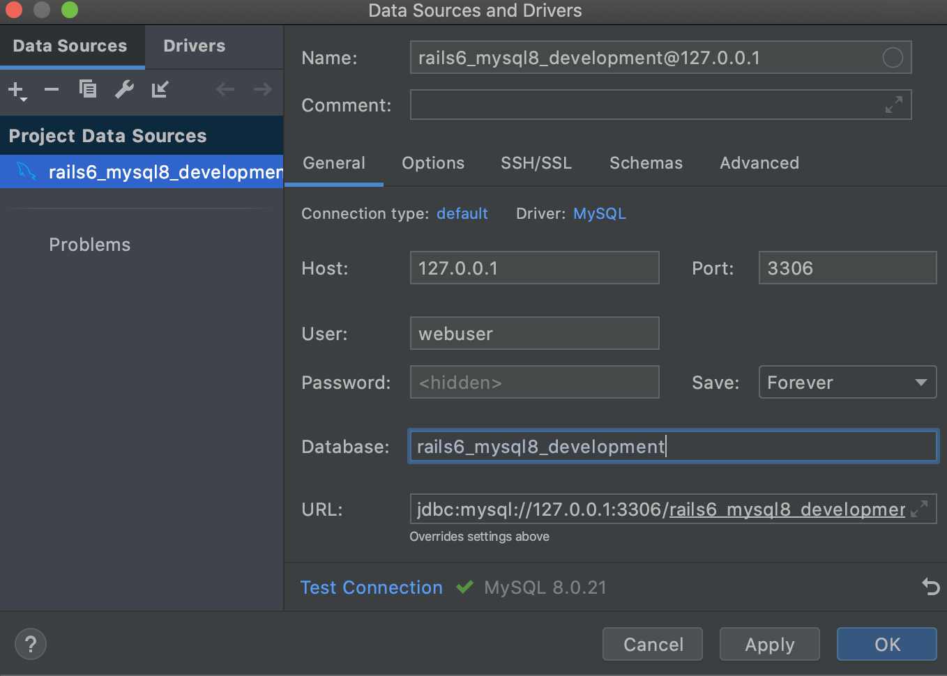 「Test Connection」をクリックするとデータベースへの接続テストができます。
