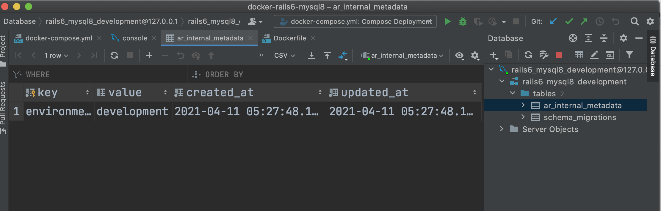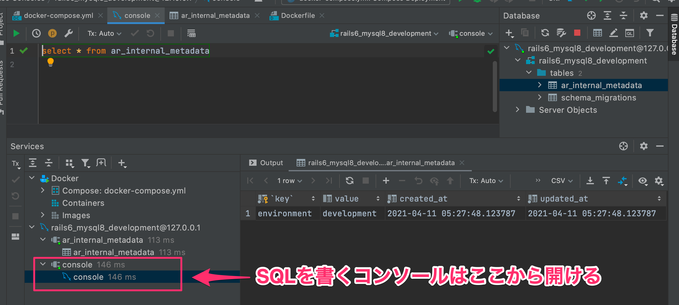 - Docker環境のDB操作はDatabasesウィンドーで行う