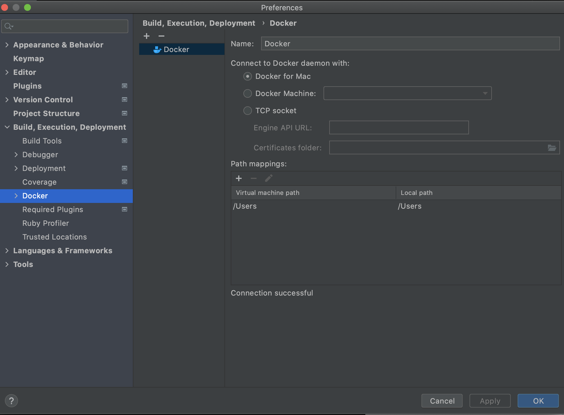 「Preferences」 → 「Build, Execution, Deployment」 → 「Docker」で設定画面を開き、RubyMine上で利用するDocker daemonを選択します。