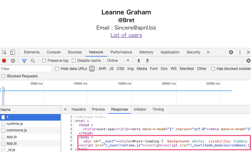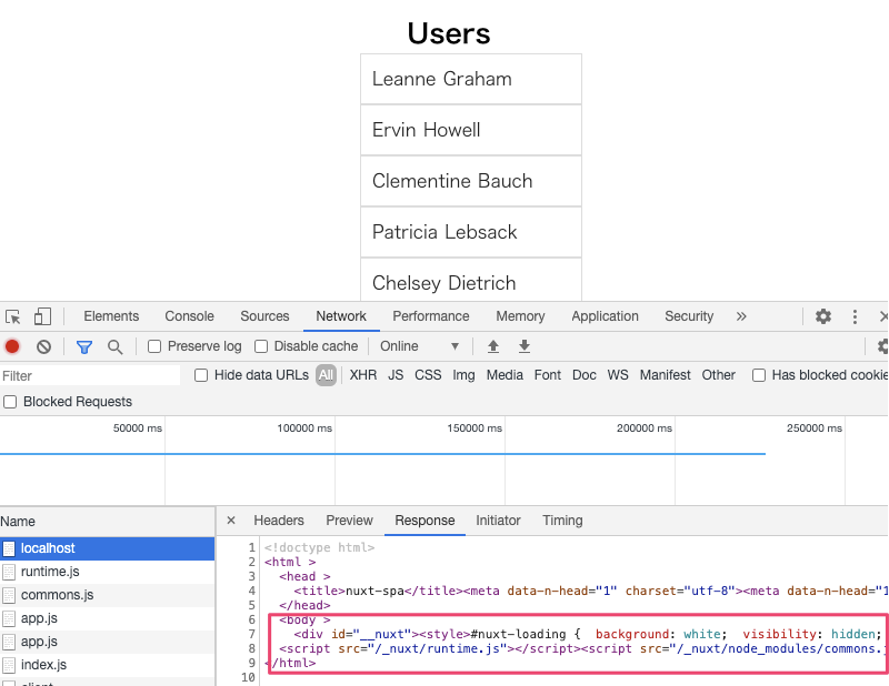 SSGではレスポンスに具体的な値が書き込まれていましたが、SPAの場合はJavaScriptが組み込まれています。