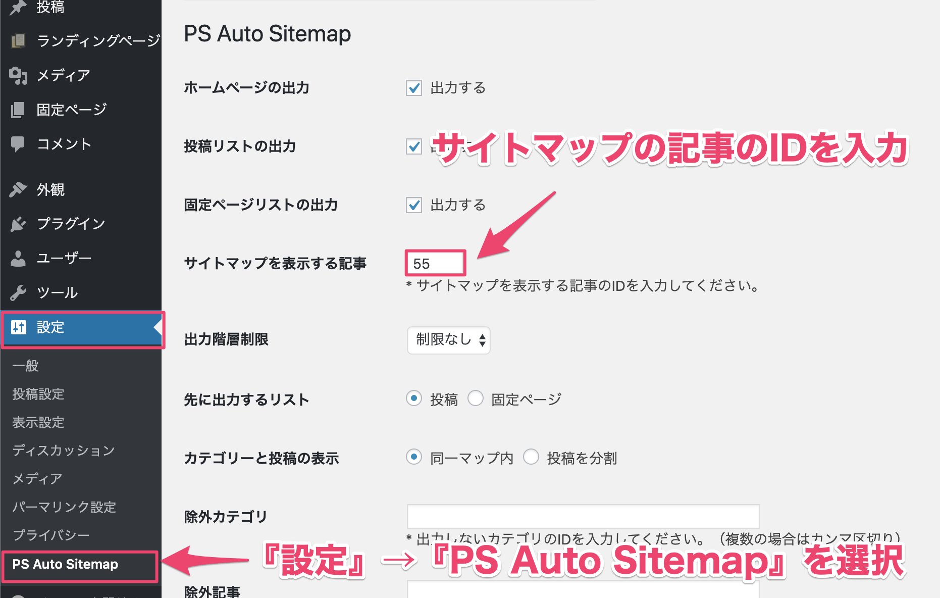 次に、『設定』→『PS Auto Sitemap』を選択します。