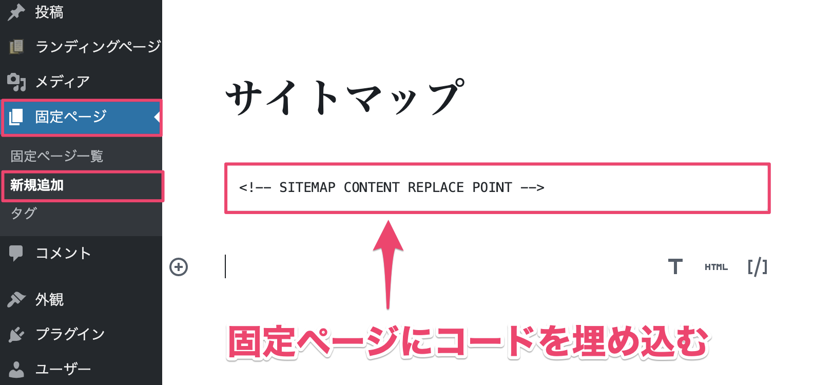 『固定ページ』 → 『新規追加』でコードを埋め込んだ記事を作成します。↓