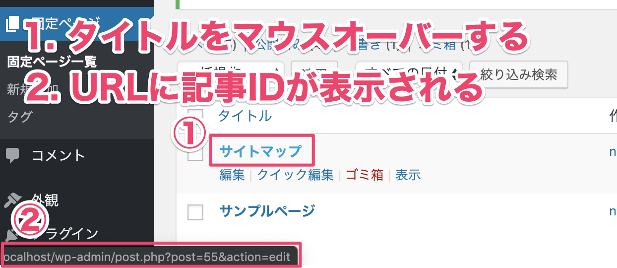 WordPressで記事IDを確認する方法はいくつかあります。例えば記事の一覧ページで、IDを調べたい記事のタイトルにマウスオーバーすると確認ができます。↓