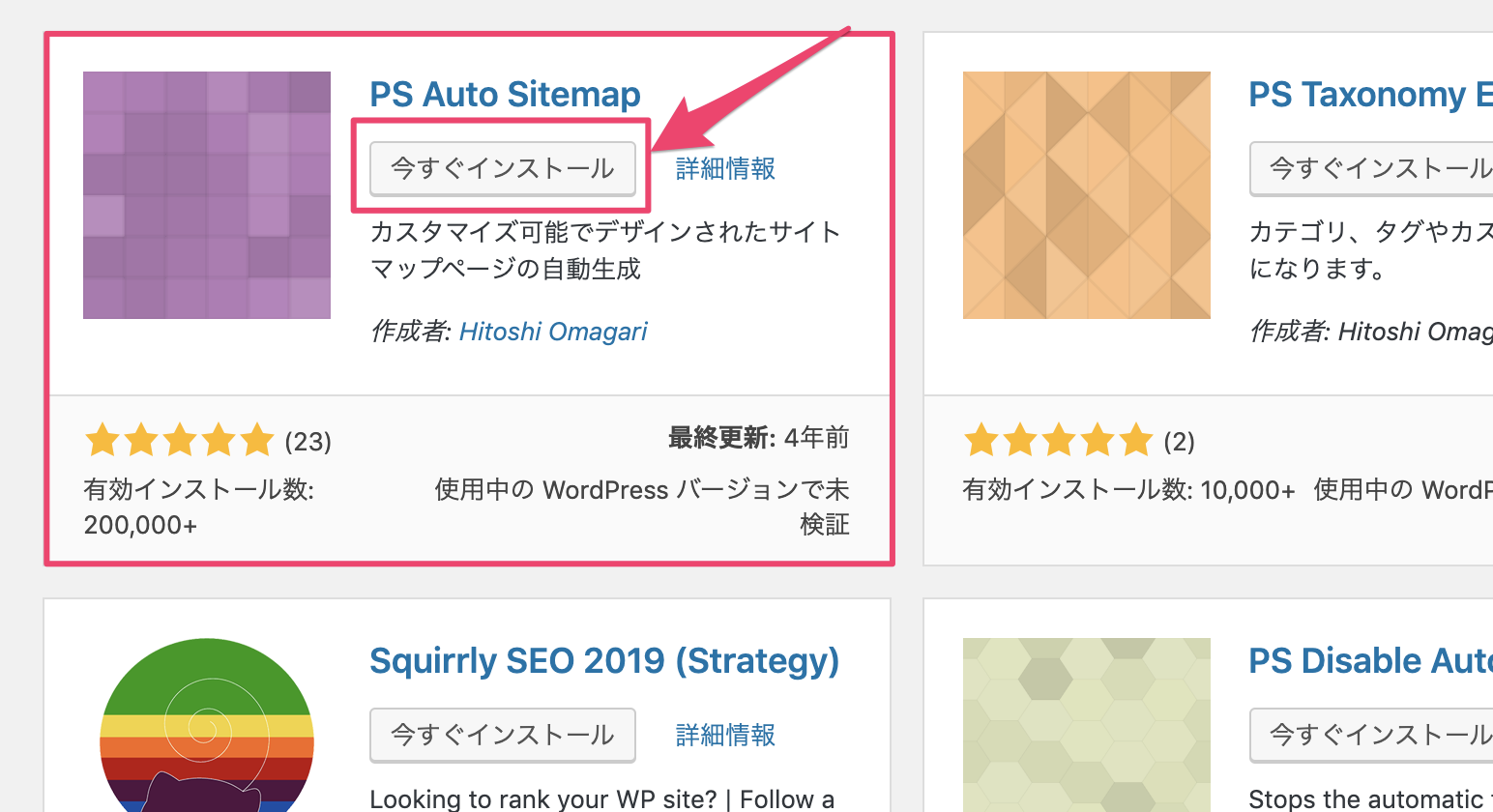 『PS Auto Sitemap』で検索をし、プラグインのインストールと有効化を行います。↓