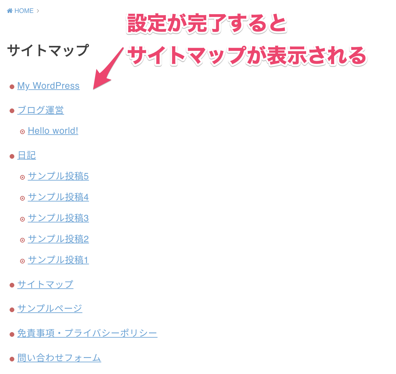 設定の保存後、先ほど作成した固定ページで以下のようなサイトマップが生成されていればOKです。↓