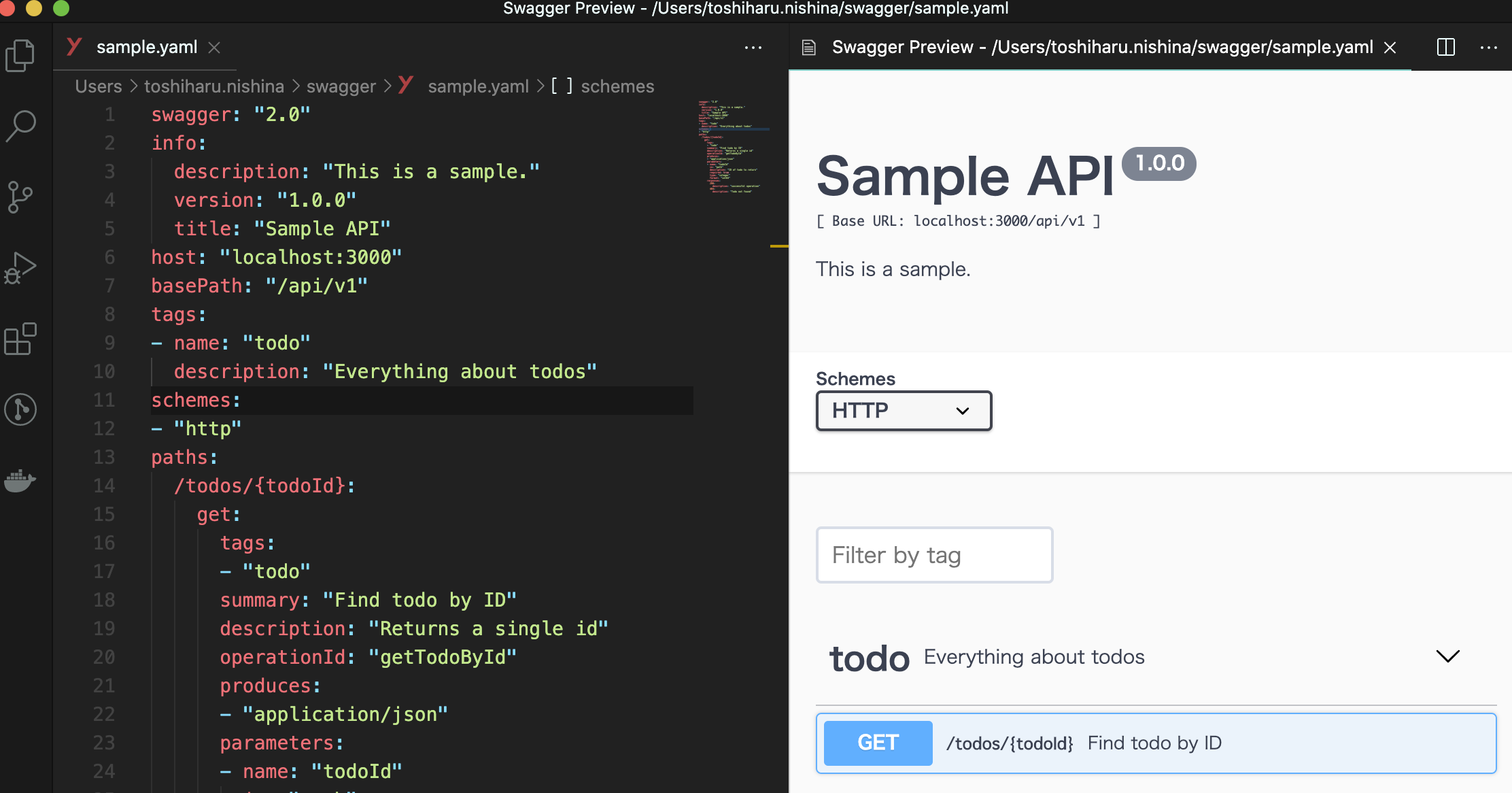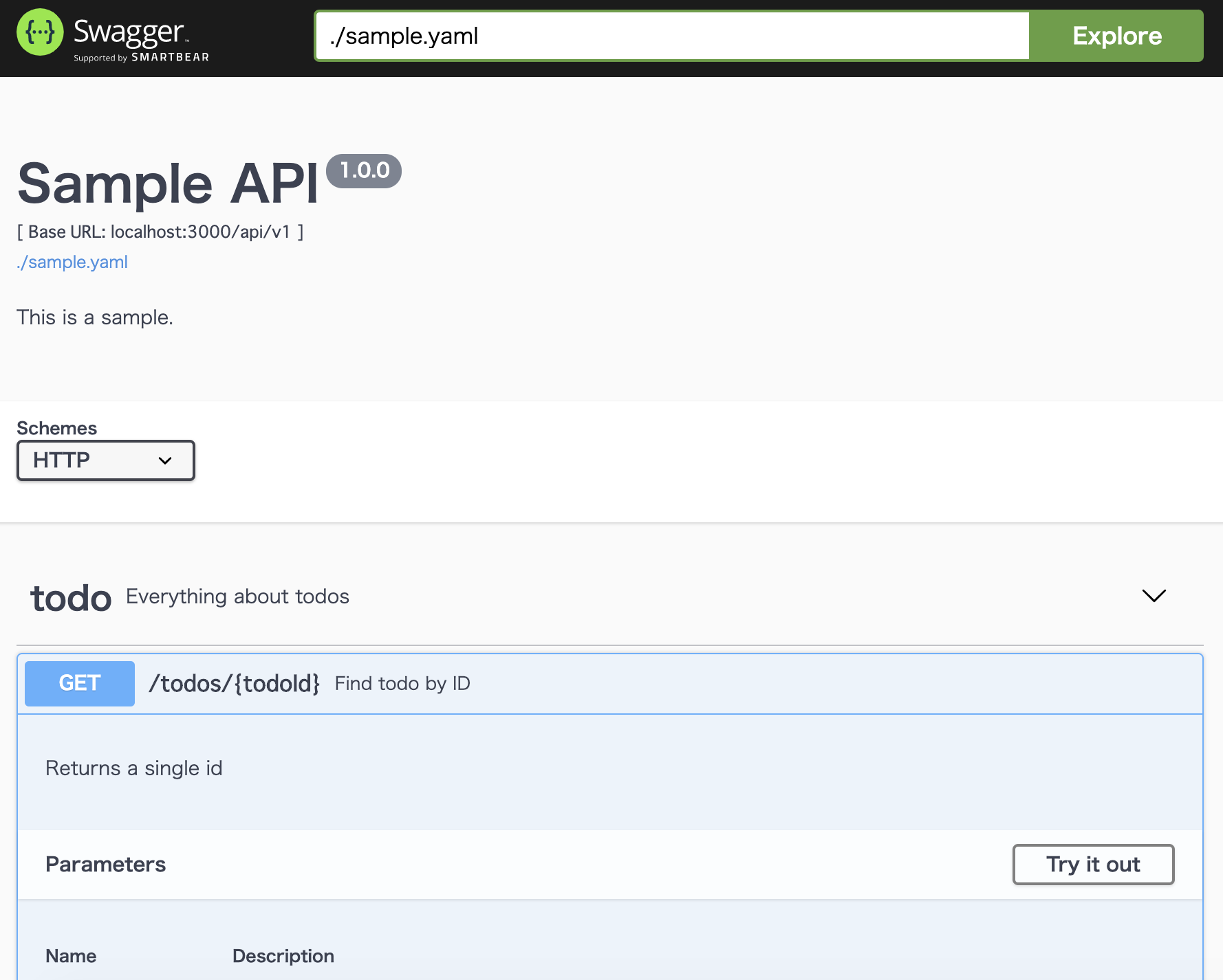 今回は~/swagger/sample.yamlというファイル名で、以下のようなSwagger Specを用意しました。