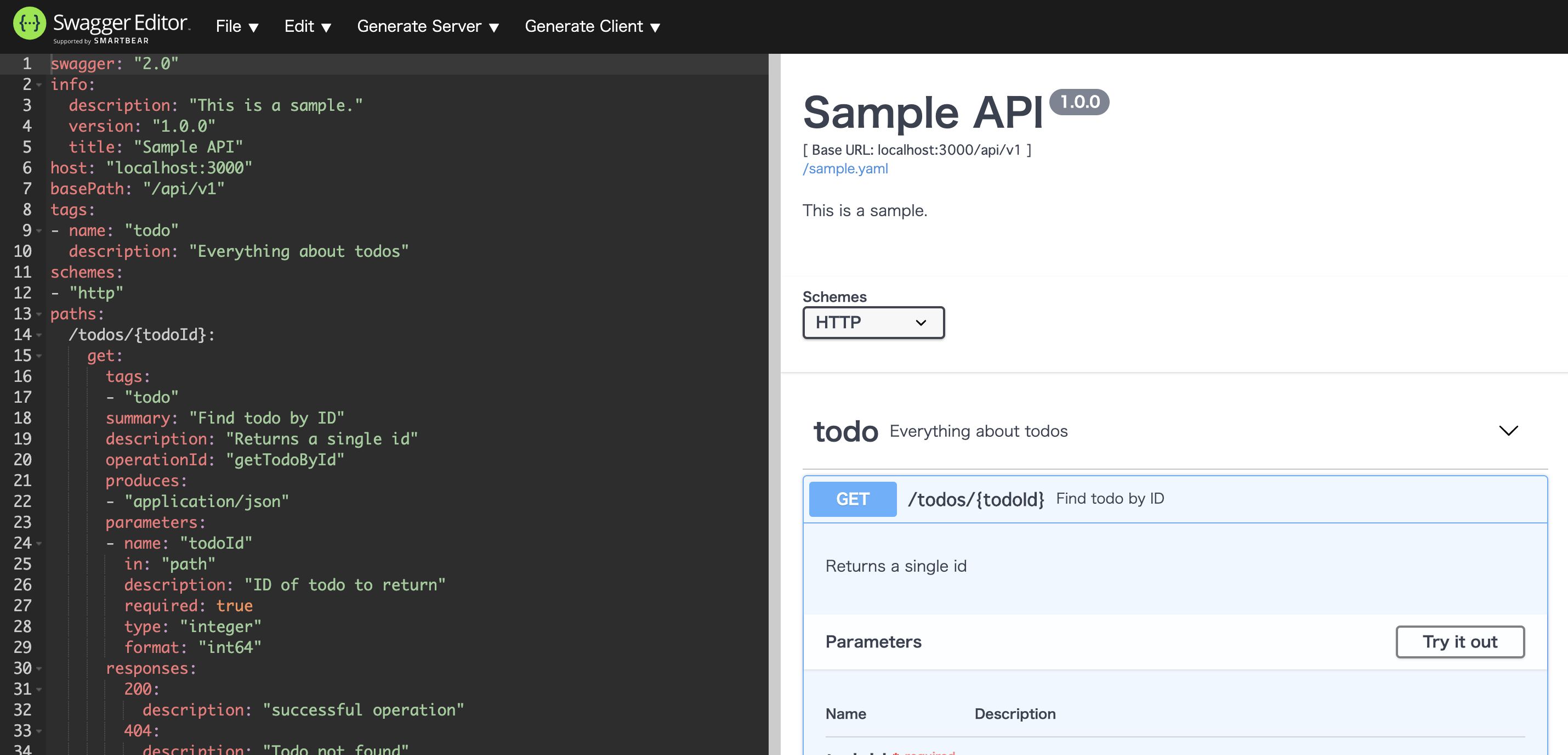 Swagger Editorを利用することでSwagger Specを修正しながらSwagger UIの変化をリアルタイムで見られます。