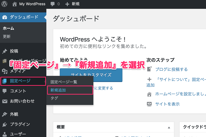 『固定ページ』→『新規追加』を選択します。