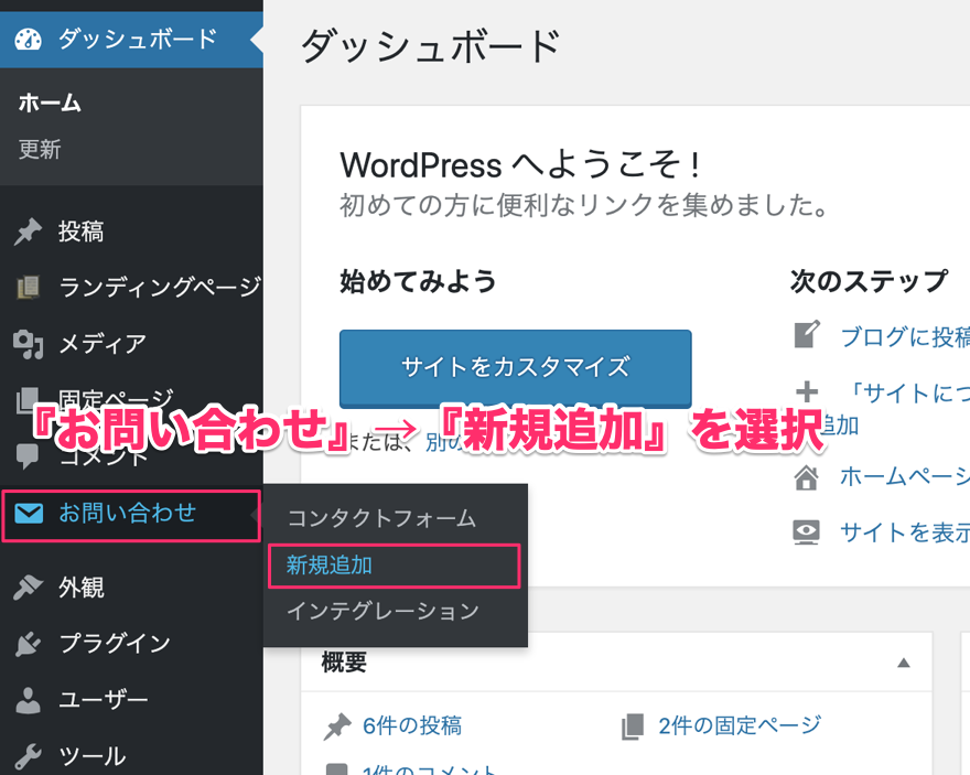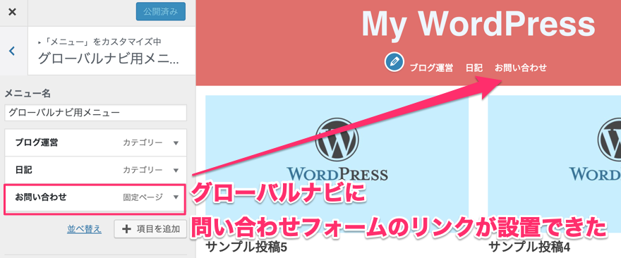 今回は『問い合わせ用の固定ページを作成し、メニューの項目に配置すること』をゴールとします。