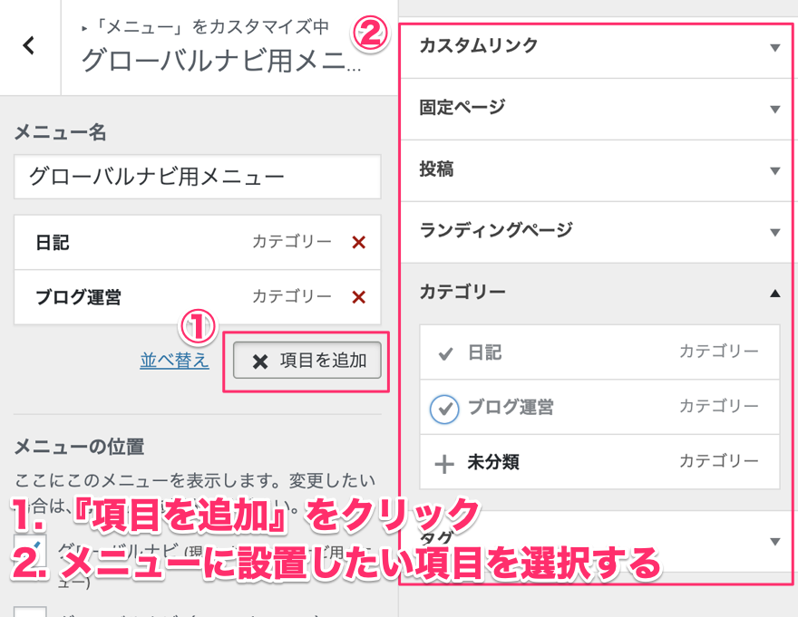 メニュー作成後に表示される『項目を追加』というボタンからメニューに設置する項目を選択します。