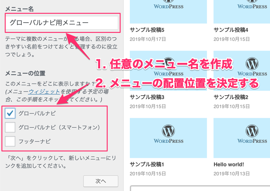 次に任意の『メニュー名』を決定後、メニューを配置したい位置を決定します。