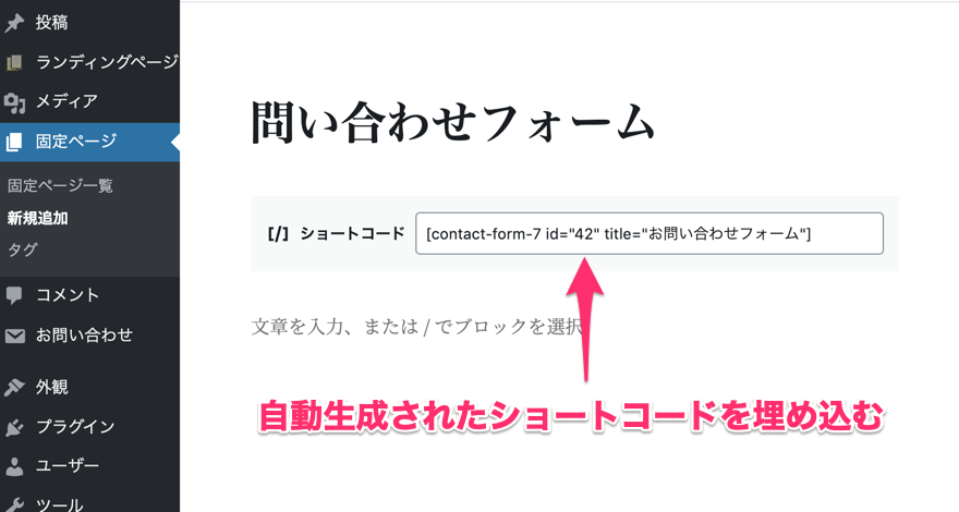 今回は例として固定ページにショートコードを埋め込み、問い合わせページを作成してみます。
