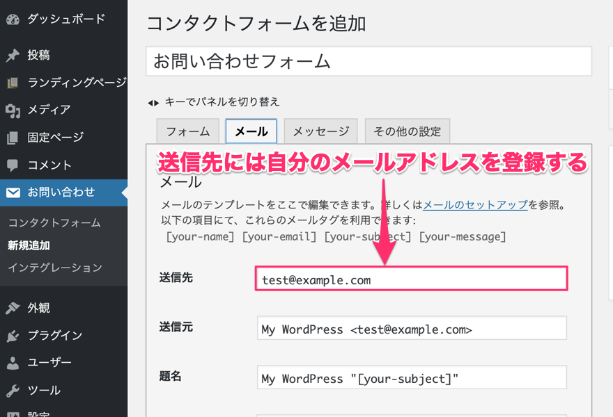 『送信先』という項目があるので、ここに自分のメールアドレスを登録しておくことでWordPressからの問い合わせを受信できるようになります。