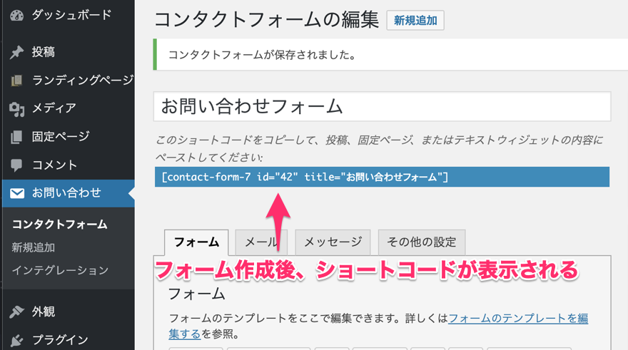 問い合わせフォームの保存が完了すると、問い合わせフォーム埋め込み用のショートコードが自動で作成されます。