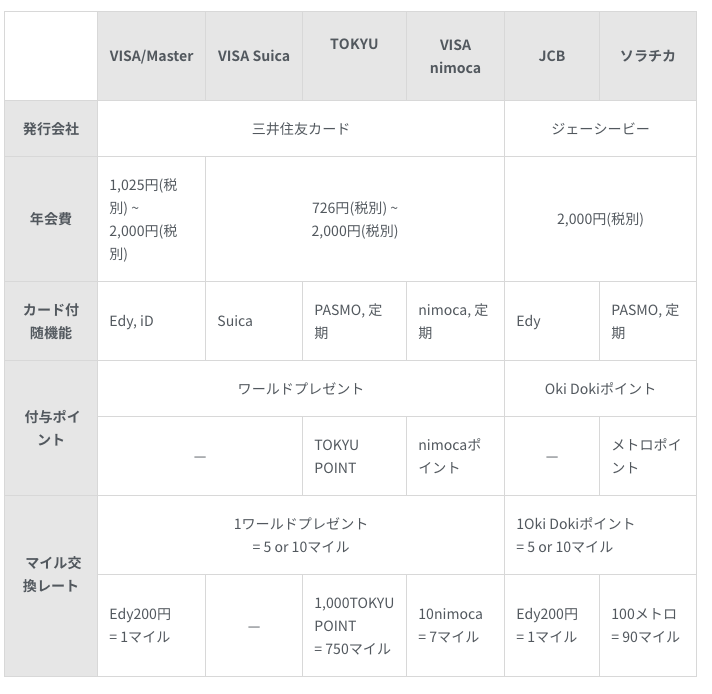 | VISA/Master | VISA Suica | TOKYU | VISA nimoca | JCB | ソラチカ | |