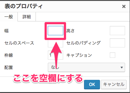 表をレスポンシブ対応させるには、表のプロパティの一般タブにある幅の項目を空白もしくは『100%』などのパーセント表示にします。