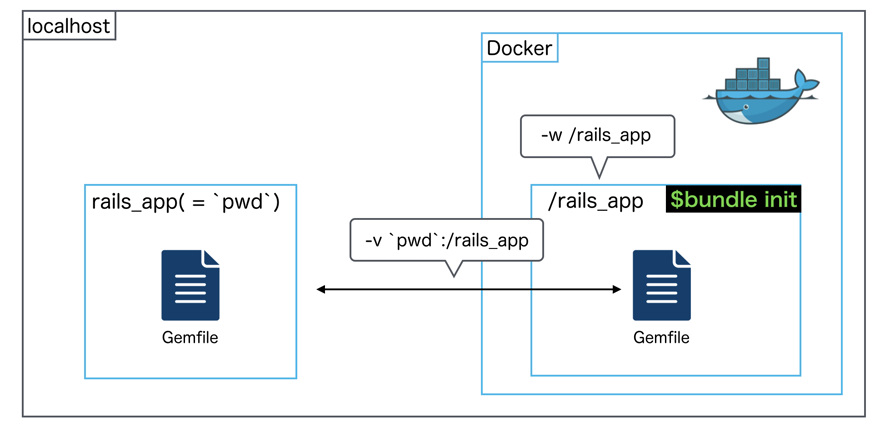 上記の説明からわかるように、ローカル環境に作成されるGemfileはDocker環境のruby・bundlerを利用しています。