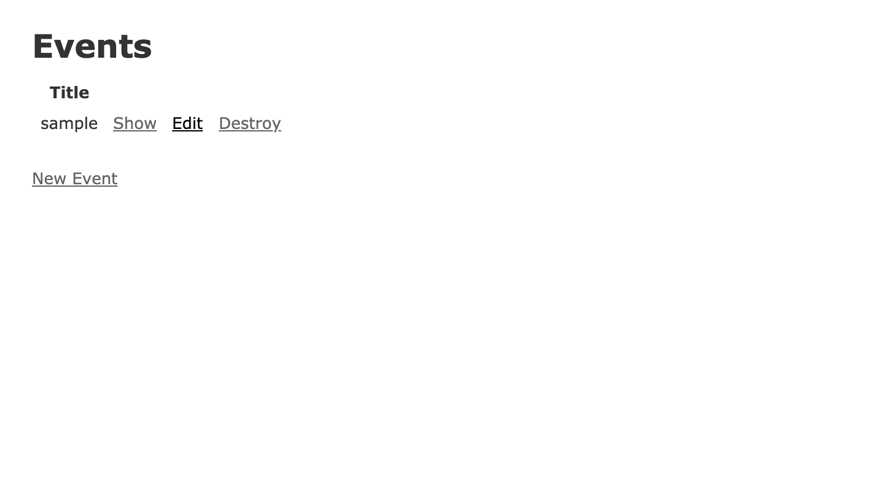 今回はEventというモデルをサンプルデータとして作成してみます。まずはscaffoldで画面を作成します。