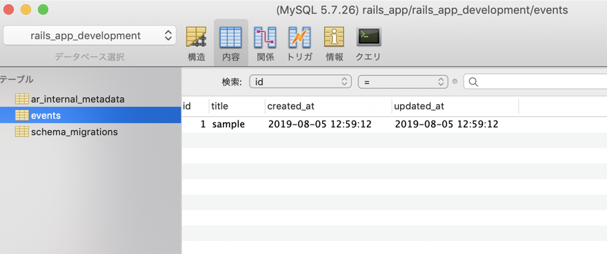 接続がうまくいくと、先ほどコンソールから確認したDocker環境のデータがローカル環境のSequel Proで見ることができます。