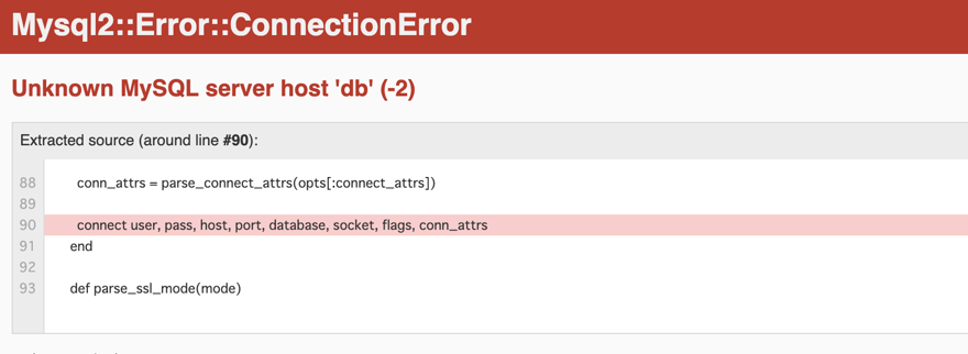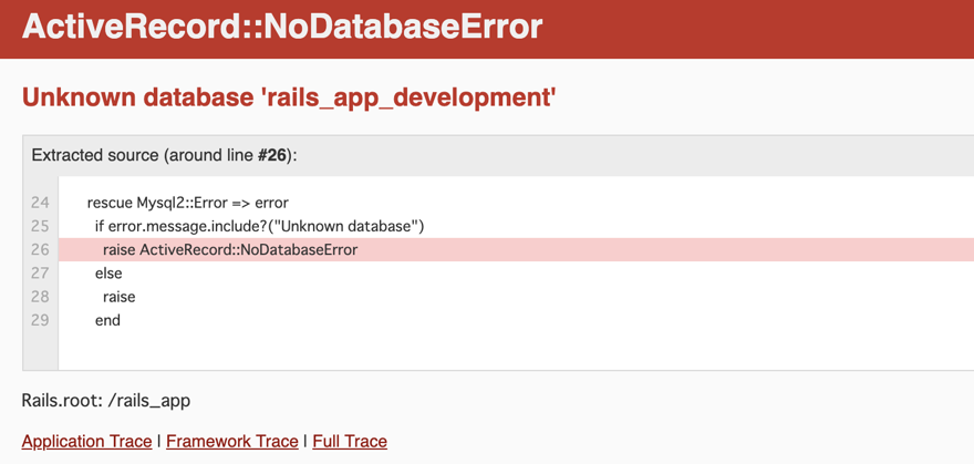 ただし、この時点ではdbコンテナは用意しましたがRuby on Railsで利用するデータベースはまだ用意していないため、以下のように『Unknown database ‘rails_app_development’』というエラーが表示されます。