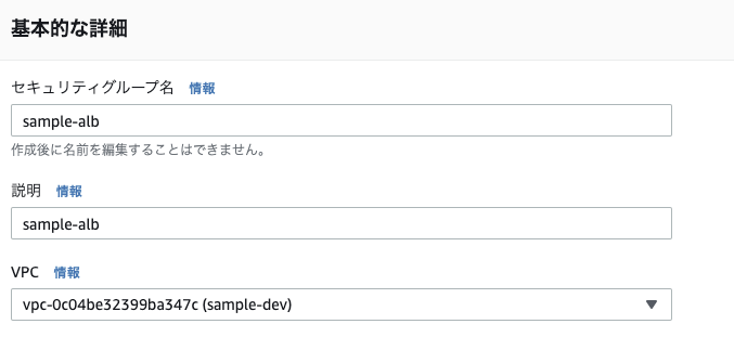 セキュリティグループ名はsample-albとし、今回利用するVPCsample-devで利用できるように設定しました。