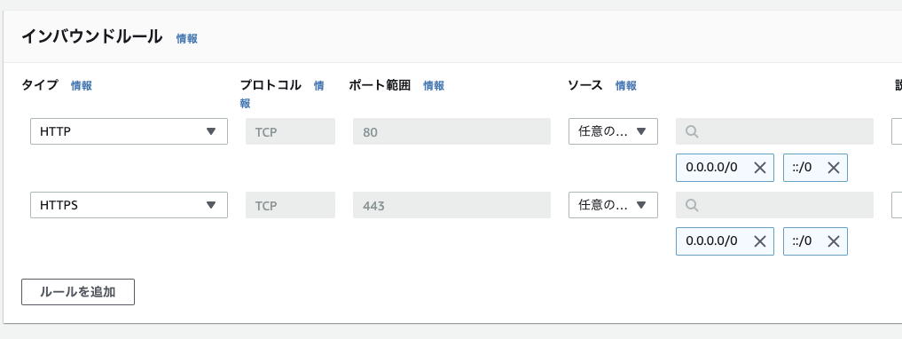 今回はALB用のセキュリティグループのため、インバウンドルールで任意のアクセス元からのHTTPとHTTPSの許可を設定しました。